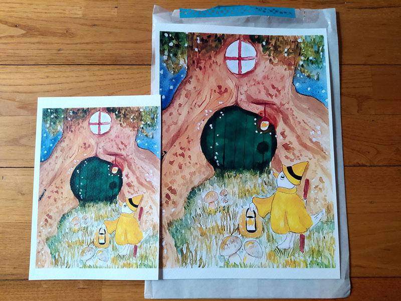 Ainsi, je propose actuellement des tirages d’art, soit des reproductions imprimées de mes illustrations sur un papier texturé se rapprochant du papier aquarelle que j’utilise habituellement. Pour l’instant, les tirages sont disponibles au format A4 et A5.